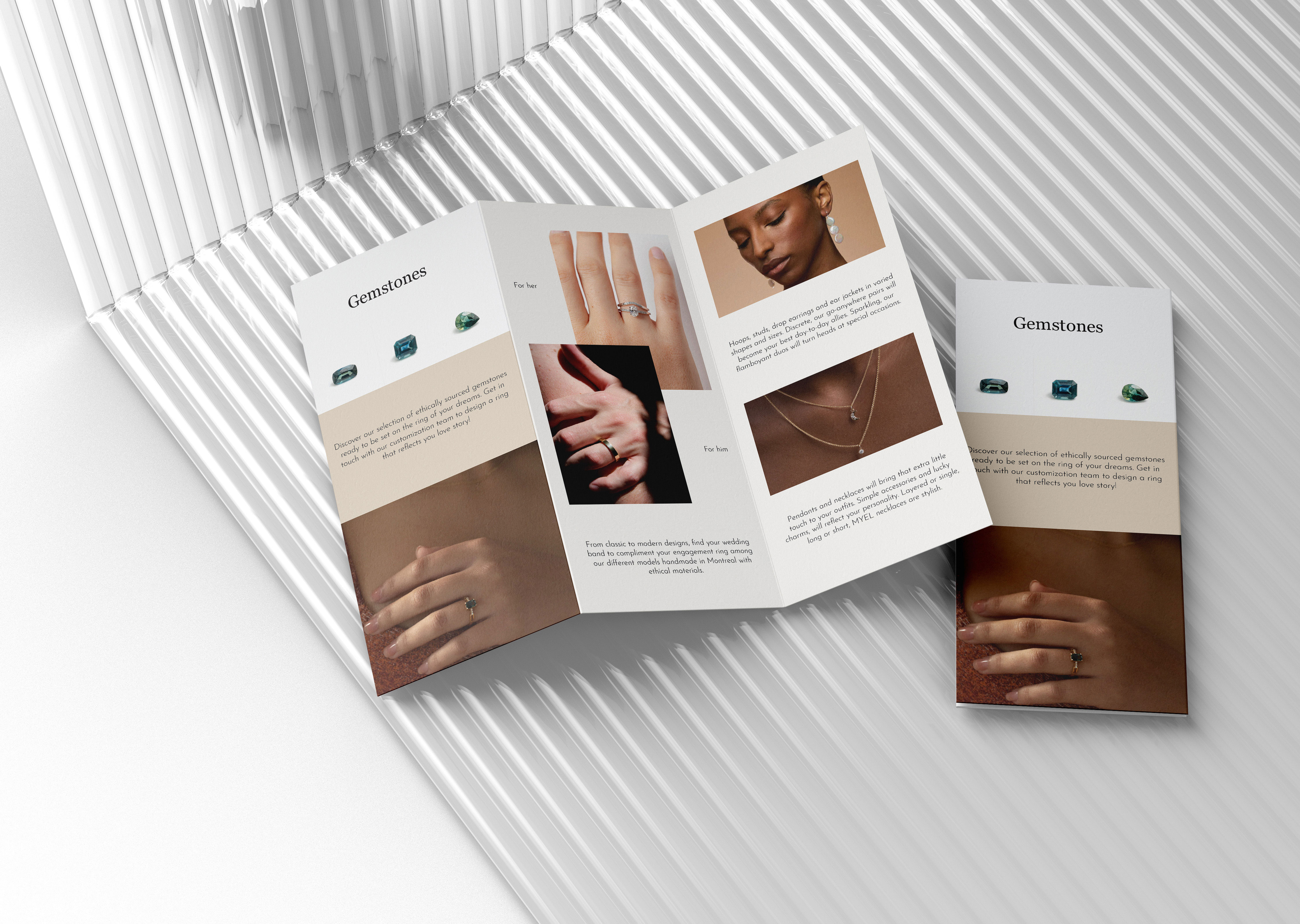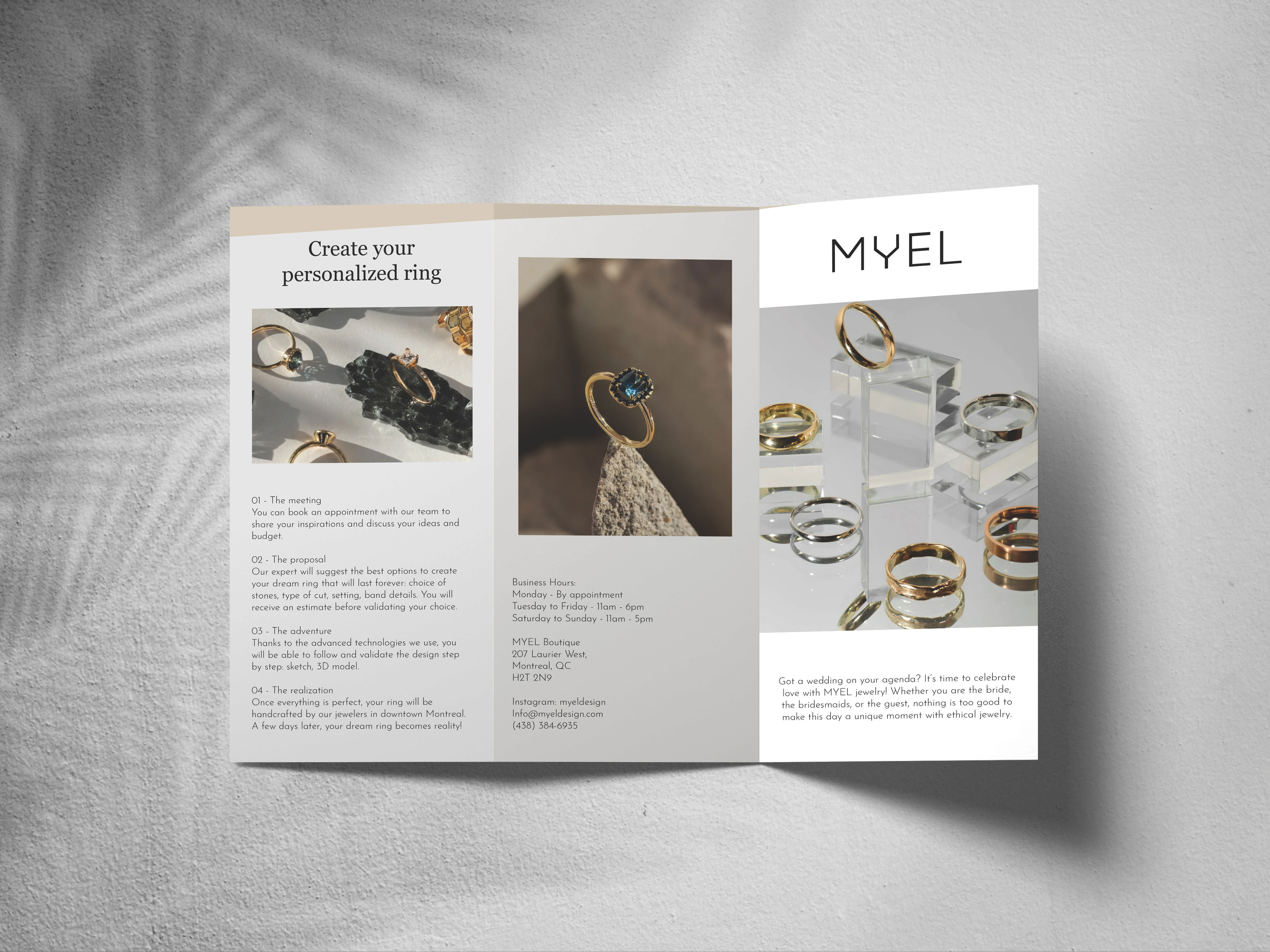 For this project, I created a trifold brochure for Myel Jewelry, focusing on their wedding collection. Using Adobe InDesign, I designed a clean and elegant layout that highlighted the beauty and sophistication of their jewelry pieces. The brochure features high-quality images from their website, showcasing rings, necklaces, and bracelets in a romantic wedding setting. The design incorporates soft, timeless fonts and delicate accents to match the elegance of their brand. This trifold is both visually appealing and informative, designed to capture the attention of customers looking for the perfect jewelry for their special day.